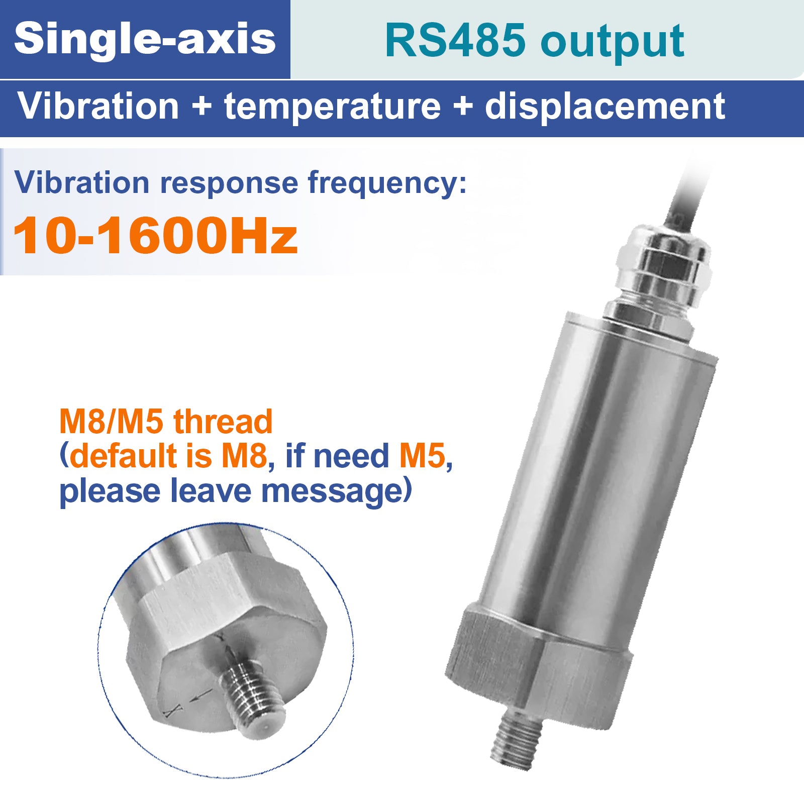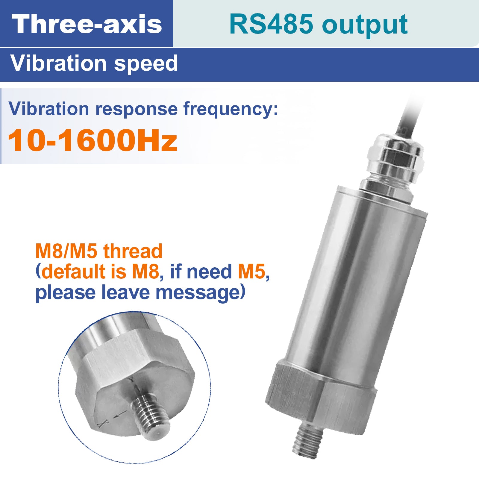 This temperature vibration sensor uses high-performance MEMS chips. Adopt embedded technology, temperature sensing technology and vibration sensing technology. It has the advantages of high performance, low power consumption and anti-interference. Widely used in motors, reducers, generators, air compressors, centrifuges, water pumps and other equipment temperature vibration measurement.