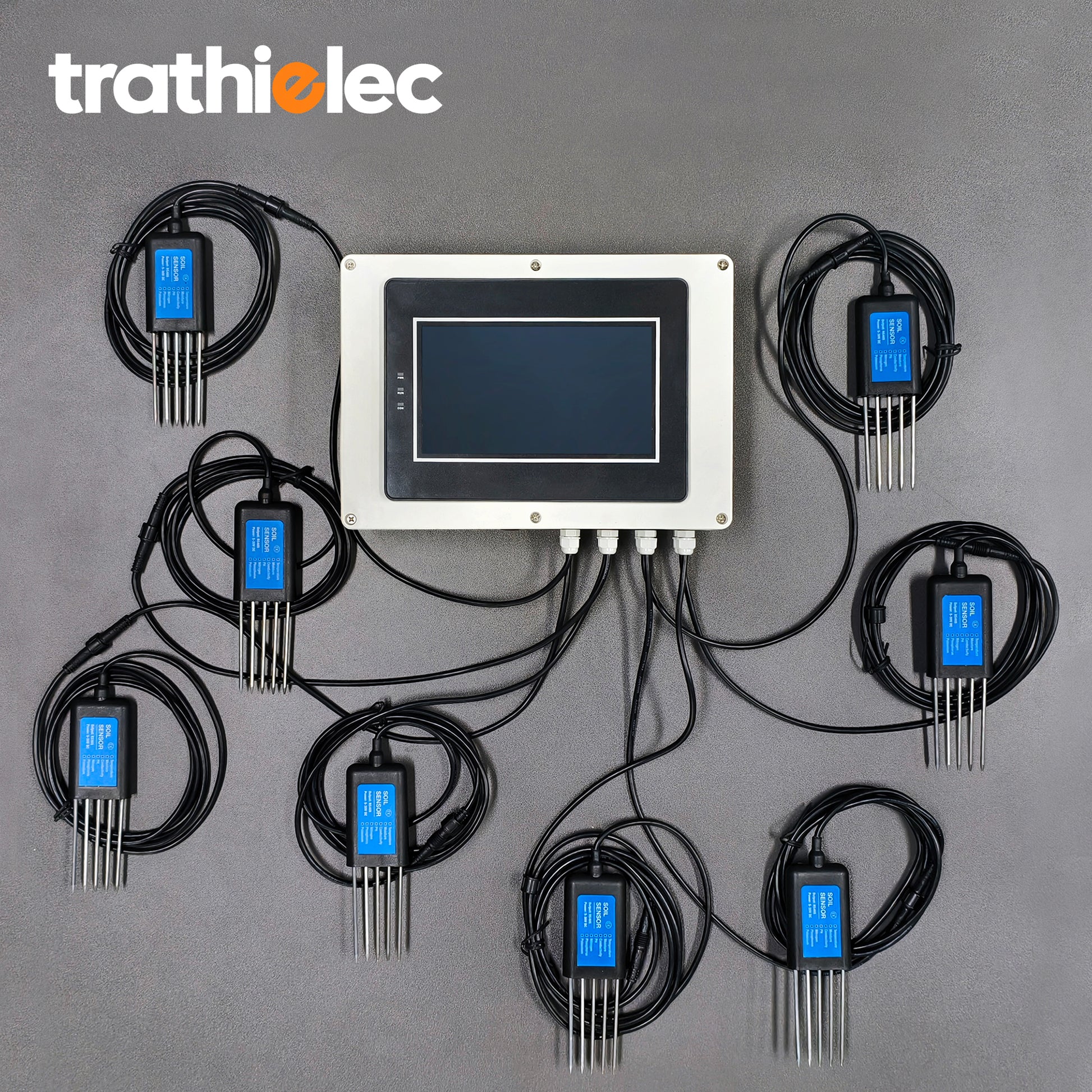 It supports up to 8 soil sensors across 8 nodes, capturing key parameters: soil temperature, moisture, EC, pH, NPK. A 7-inch LCD touchscreen enables easy operation, showing real-time values, curves, and logs.
